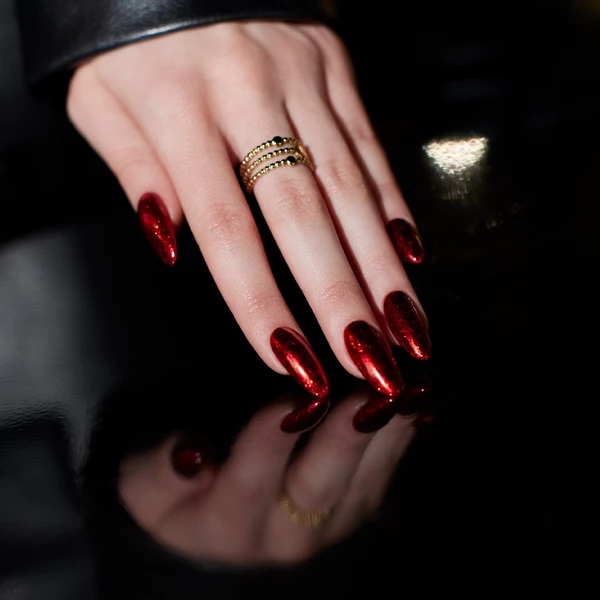 Η σκόνη νυχιών παρουσιάζεται όμορφα σε σκούρο φόντο, π.χ. Mr. Black