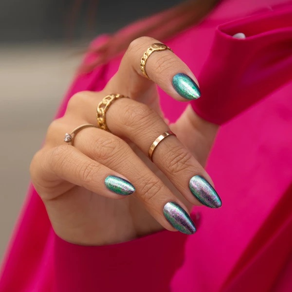 Μπορείτε επίσης να εφαρμόσετε νιφάδες μόνο σε μέρος του νυχιού και να δημιουργήσετε ένα εφέ παρόμοιο με σφραγισμένο φύλλο αλουμινίου