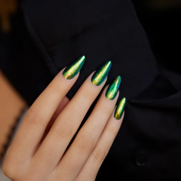 Η σκόνη νυχιών παρουσιάζεται όμορφα σε σκούρο φόντο, π.χ. Mr. Black
