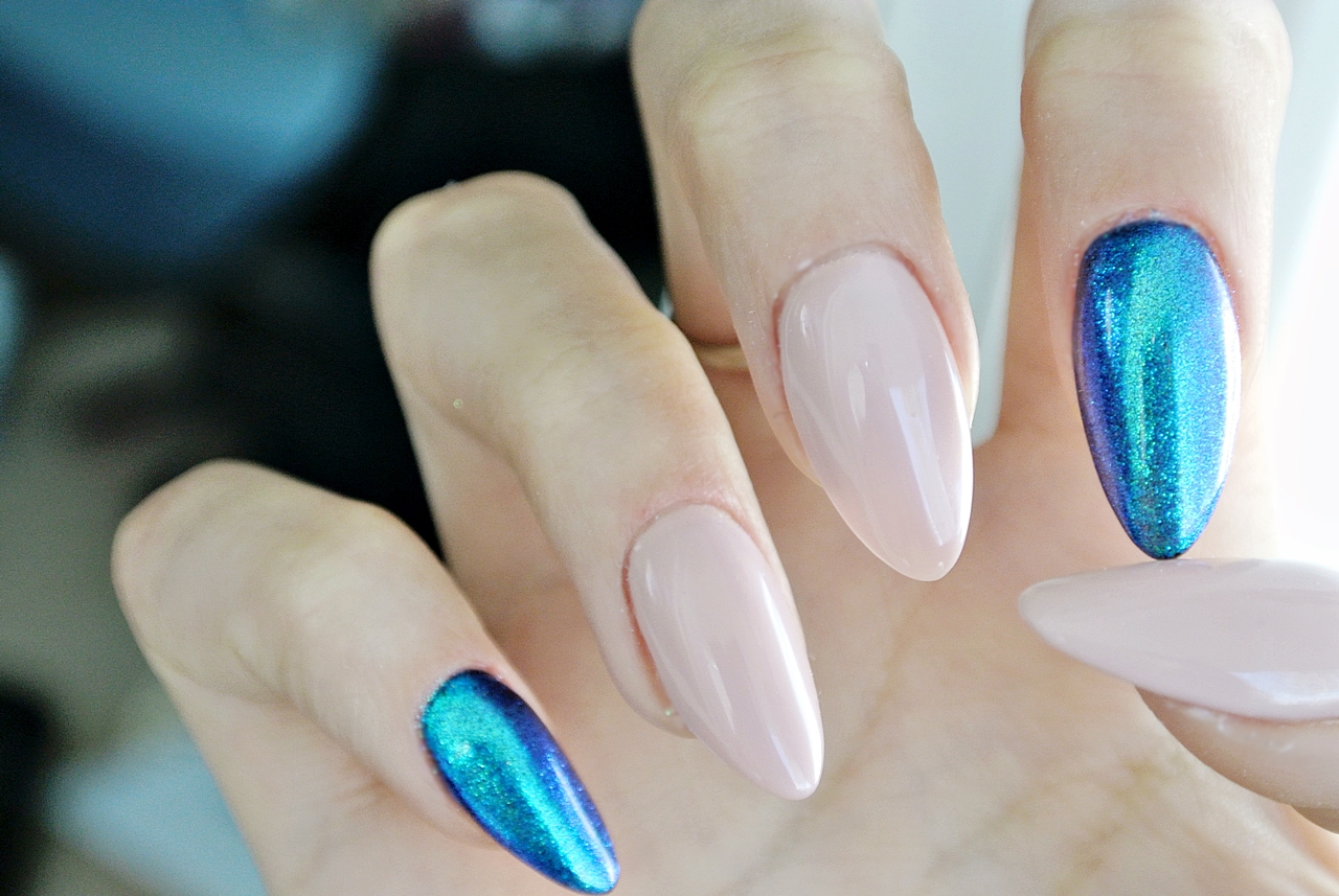 Αφού σκληρύνει το δεύτερο στρώμα χρώματος, τρίψτε το εφέ Mermaid στο κολλώδες στρώμα του ή εφαρμόστε την ειδική για εφέ πούδρας Effect Base και μόλις σκληρυνθεί στη λάμπα Multi LED για 30 δευτερόλεπτα, τρίψτε τη σκόνη στο κολλώδες στρώμα του.